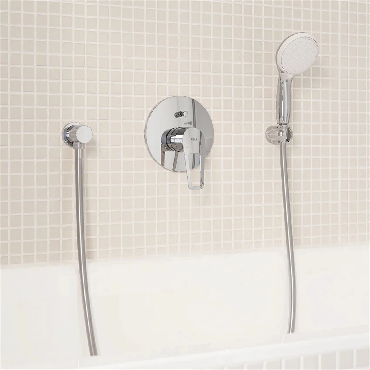 Suprafata GROHE Long-Life ofera rezistenta indelungata, iar sistemul GROHE FastFixation escutcheon cu fixare acoperita faciliteaza instalarea. Setul complet pentru instalare finala include un corp ingropat, limitator de debit reglabil si un divertor cu revenire automata pentru cada si dus. Ornamentul metalic si elementul de etanseizare asigura un finisaj impecabil.