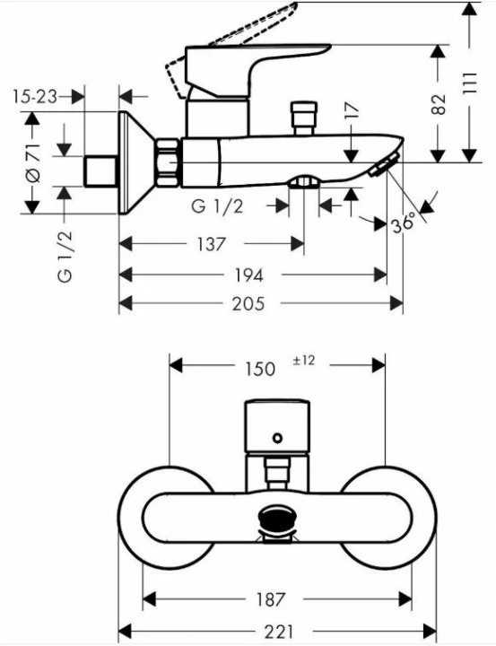 Bateria pentru cada si dus face parte din gama Hansgrohe colectia Talis cu montaj pe perete. Este fabricata din alama sanitara cu finisaj auriu si compusa din: conexiuni excentrice, cartus ceramic, limitator de temperatura ajustabil, divertor automat de la cada la dus, valva anti-retur si conexiuni DN 15. Bateriei pentru cada si dus ii sunt atribuite tehnologiile: AirPower care ofera un sistem inovativ de mixare a apei cu aerul oferind astfel o atingere fina, ComfortZone care ofera un spatiu si un confort in functie de inaltime si tehnologia QuickClean care ofera o curatare fina si eficienta a duzelor printr-o simpla frecare a duzelor elastice din silicon. Debitul la 3 bar: pipa cada 19 l/min si para de dus 17 l/min.