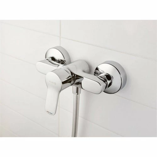 Bateria de dus Kludi Pure & Easy este realizata din alama sanitara de culoare crom, prezinta un maner solid, plin, cartus ceramic cu limitator de apa fierbinte ( previne oparirea prin posibilitatea limitarii temperaturii la 38° C), clasa de debit B (B ≤ 25 l/min la o presiune de 3 bari), protectie impotriva fluctuatiilor de presiune a apei, excentrice G 1/2 (toli) si se monteaza pe perete. DN 15 : diametrul nominal al racordului pe interior este de 15 mm. Corpul bateriei este realizat din alama cu nivel scazut de plumb, ceea ce inseamna ca nu se deformeaza si nici nu intra in rezonanta.