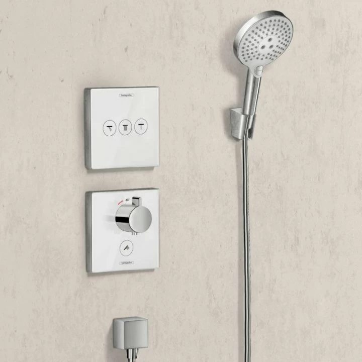 Bateria pentru dus din gama Hansgrohe colectia ShowerSelect este o baterie termostatata, confectionata din alama sanitara cu finisaj crom si are montaj incastrat. Este prevazut cu limitator de temperatura reglabil, valva de siguranta la 40°C si buton on/off pentru selectarea functiei. Bateria este livrata cu buton pentru comutarea pe para de dus. Debitul pentru dusul de mana este de 34 l/min la 3 bar iar debitul superior de iesire este de 59 l/min la 3 bari. Presiunea minima de lucru este de 1 bar iar cea maxima este de 10 bari. Necesita divertor (Cod: 15764000) si corp incastrat ce se achizitioneaza separat ( vezi produse recomandate - Cod: 01800180).