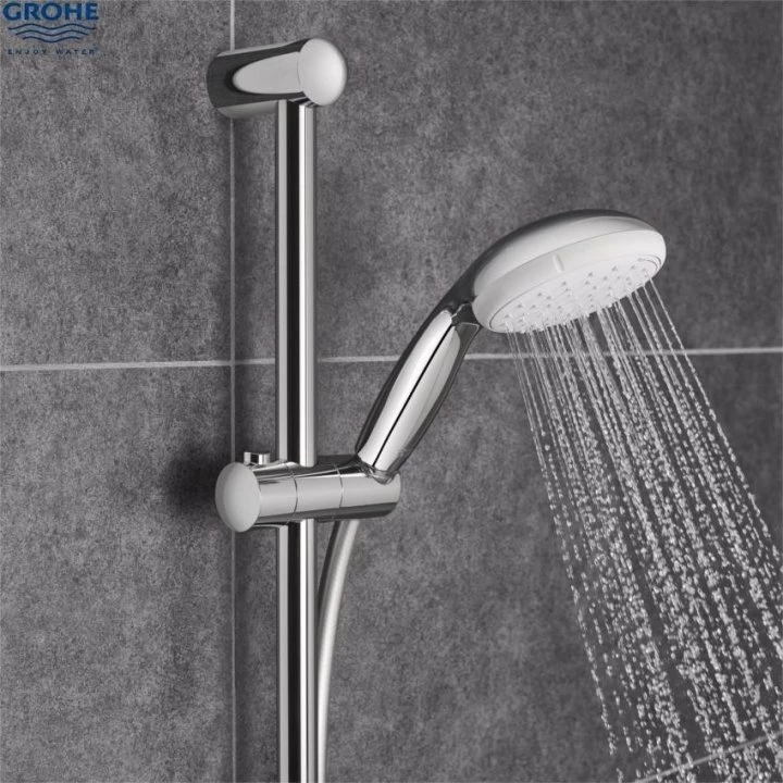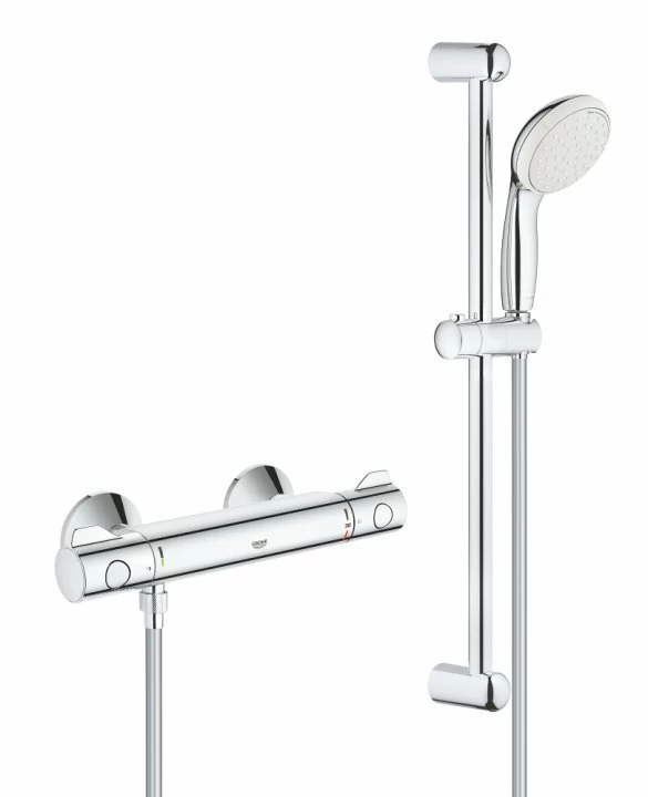 Sistem pentru dus Grohe face parte din colectia Grohtherm, fabricata din alama sanitara de culoare crom cu montaj pe perete. Sistemul de dus cu baterie termostatata este alcatuit din: bateria de dus compusa din: cartus compact cu termoelement din ceara, dispozitiv incorporat cu inchidere pentru mixarea apei, limitator de temperatura de pana la 43°C, maner pentru volum, garnitura ceramica 1/2 180°, filtru de impuritati, supapa integrata contra refluxului, conexiuni excentrice; para de dus, bara e dus 600 mm, furtun de dus Relexaflex de 1750 mm 1/2 x 1/2, sistem anti-calcar si protectie din silicon. Presiunea minimă recomandată 1.0 bar. Caracteristicile deosebite ale acestui sistem de dus sunt tehnologiile Grohe: StarLight cuprafata cu finisaj cromat ofera luciu superior pe termen indelungat, rezistenta la zgarieturi si permite curatarea usoara a acesteia, SpeedClean prin care duzele din silicon cu suprafata anticalcar, permite indepartarea cu usurinta a depunerilor de calcar printr-o simpla stergere cu mana sau carpa uscata si tehnologia EcoJoy tehnologie de economisire a apei pana la 50%, fara a compromite calitatea jetului de apa.