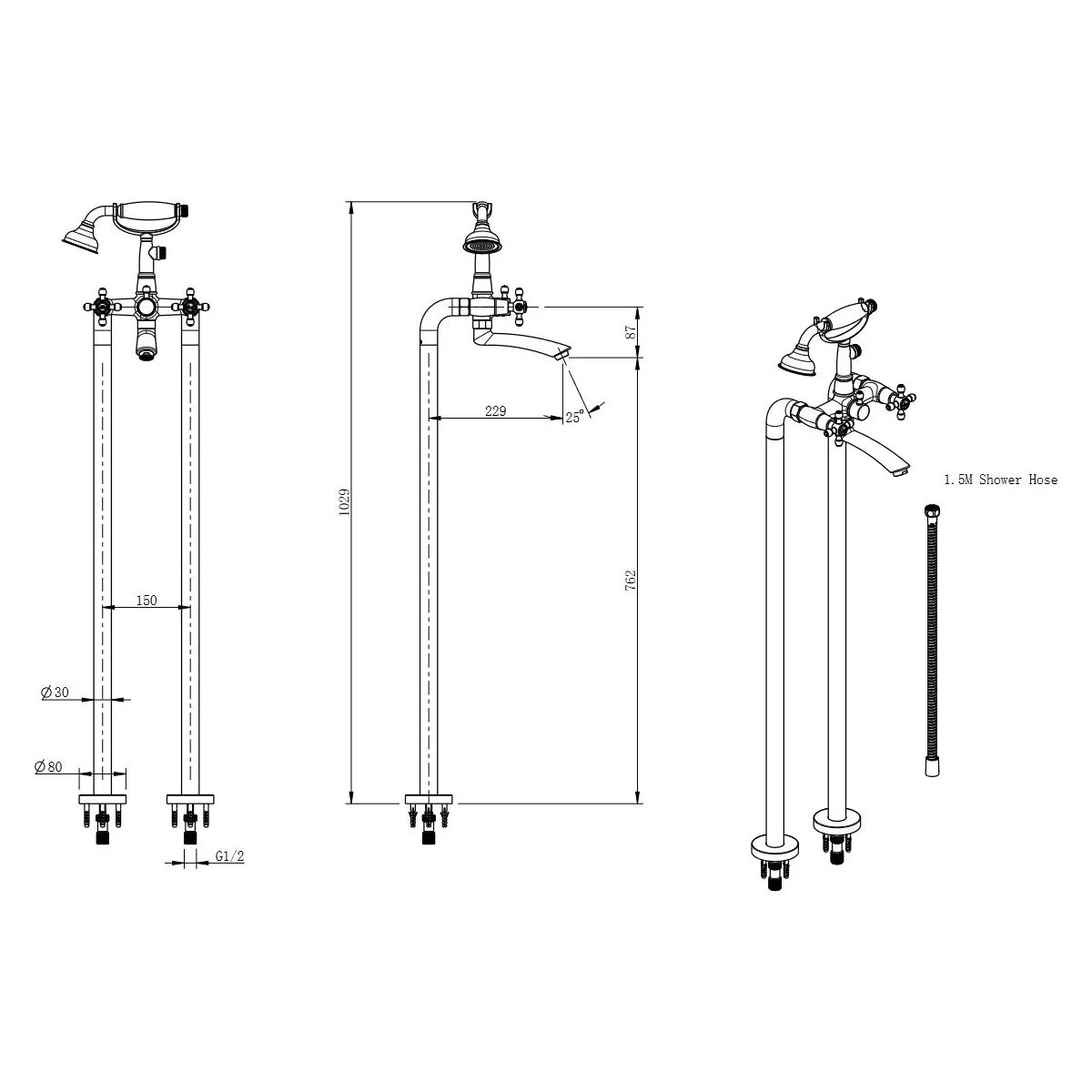 Gura de scurgere are o lungime de 22,9 cm, iar inaltimea de iesire a apei ajunge la 76,2 cm, oferind confort in utilizare alaturi de o cada freestanding. Setul include si un dus de mana realizat din alama, cu furtun de 150 cm, ideal pentru o utilizare flexibila si practica. Atat corpul bateriei, cat si componentele principale sunt fabricate din alama, ceea ce garanteaza rezistenta si fiabilitate pe termen lung.