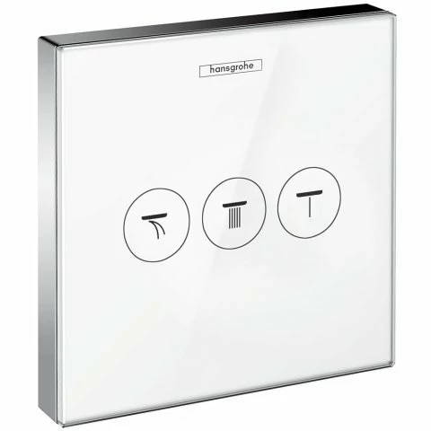 Divertor pentru dus cu 3 iesiri cu montaj pe perete, din gama Hansgrohe, colectia ShowerSelect Glass are finisaj alb-crom si dimensiune 156*156 mm. Cele 3 iesiri se pot ultiliza simultan. Dispune de tehnologia inovativa Select - tehnologie cu ajutorul careia se poate selecta usor tipul de jet dorit cu un singur click. Bateria este prevazuta cu butoane pentru cele 3 tipuri de jet: Waterfall, Rain large si Mono. Necesita corp incastrat ce se achizitioneaza separat - (Cod: 01800180)