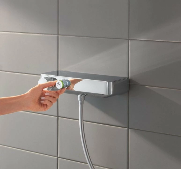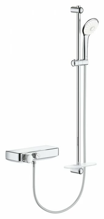 Sistemul pentru dus Grohe face parte din colectia SmartControl, fabricata din alama sanitara de culoare crom cu montaj pe perete. Sistem de dus cu baterie termostatata este alcatuita din: bateria termostatata Grohe SmartControl; bara de sustinere H600 mm; para de dus mobila cu 3 tipuri de jet: Rain, SmartRain, Massage; suport para de dus si furtunul de dus cu protectie din plastic 1750 mm. Caracteristicile deosebite ale acestui sistem de dus sunt tehnologiile Grohe: CoolTouch prin care bateria detine o izolatie integrata pentru preventia supraincalzirii suprafetei, caracteristica importanta, in special, pentru siguranta copiilor; StarLight in care suprafata cu finisaj cromat ofera luciu superior pe termen indelungat, rezistenta la zgarieturi si permite curatarea usoara a acesteia; SafeStop Plus o functie de siguranta pentru temperatura apei, setata la 38°C. Selectia unor temperaturi mai mari se face prin apasarea butonului. Optional, pentru siguranta suplimentara se activeaza limitatorul de temperatura GROHE SafeStop Plus, care nu depaseste 43°C; TurboStat o tehnologie care asigura control precis a apei si temperatura constanta, indiferent de fluctuatiile presiunii; SmartControl o tehnologie cu functie de memorare integrata, permite prin simpla actionare si rotire a butonului on/off: selectarea tipului de jet, comutarea intre jeturi sau combinarea acestora, ajustarea temperaturii si debitului de apa. Volumul de apa selectat va reveni la setarile initiale, in momentul repornirii. Activarea simultana a dusului fix si a parei de dus se realizeaza prin actionarea ambelor butoane si tehnologia EasyReach prin care bateria este prevazuta cu etajera integrata pentru depozitarea produselor de ingrijire.