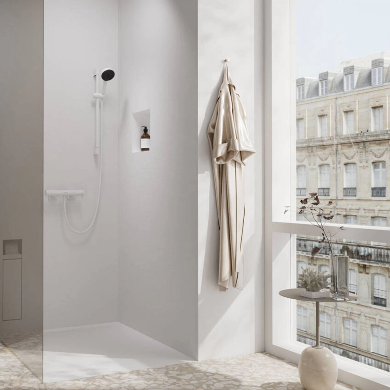Setul de dus Hansgrohe Pulsify Select 105 Relaxation ofera functionalitate si confort in orice baie. Cu montare pe perete si un finisaj mat alb, setul include un cap de dus de 105 mm cu trei tipuri de pulverizare: PowderRain, IntenseRain si masaj.