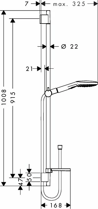 Setul este compus din: para de dus Raindance Select E 120 cu 3 tipuri de jet,bara de dus Unica`S Puro de 90 cm, savoniera Casetta E, furtun de dus Isiflex 1.60 m,distantator de perete pentru bara. Dimensiunile produsului sunt:1008 x 168 mm.