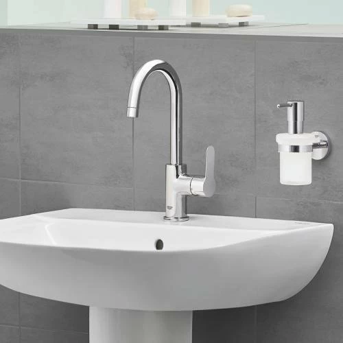 Bateria pentru lavoar face parte din gama Grohe colectia BauEdge cu montaj pe lavoar. Este fabricata din alama sanitara cu finisaj crom si compusa din: maner metalic, cartus ceramic de 28 mm, aerator cu debit de 5.7 l/min, pipa tubulara pivotanta, set de evacuare cu tija plastica 1 1/4 si racorduri de conectare la apa. Bateriei pentru lavoar ii sunt atribuite tehnologiile: StarLight prin care suprafata cu finisaj cromat ofera luciu superior pe termen indelungat, rezistenta la zgarieturi si permite curatarea usoara a acesteia și etanșare oferind astfel rezistenta la presiune si tehnologia EcoJoy prin care se asigura un consum redus de apa (pana la 50%), fara a compromite performantele produsului.