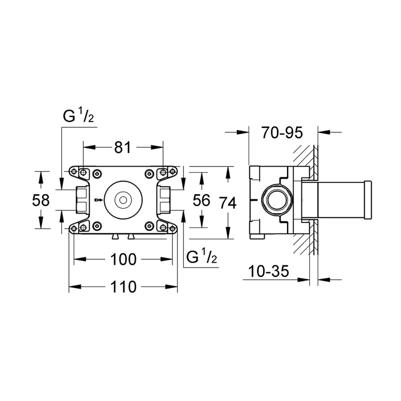 Corp incastrat Grohe Grohtherm F, ideal pentru instalarea sistemului de dus Grohtherm Custom. Acest corp ingropat se monteaza intr-un spatiu de adancime intre 70 si 95 mm si se adapteaza atat la constructii din zidarie, cat si la perete din gips-carton.