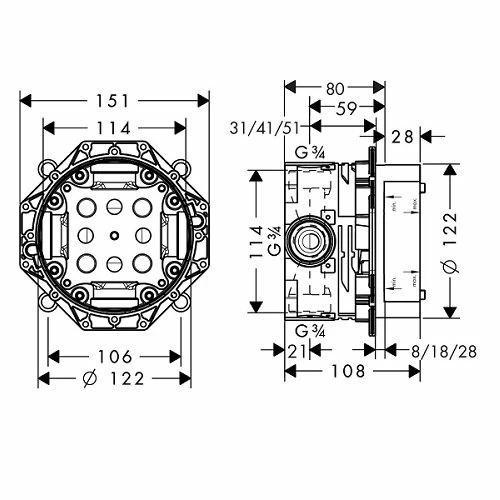 Corp incastrat face parte din gama Hansgrohe, colectia IBOX. El beneficieaza de 3 reduceri DN20, 1 mufa DN20, guler de prindere reglabil cu filet de conectare G ¾. Acest corp este dedicat pentru dusurile incastrate si pentru instalarea ascunsa.