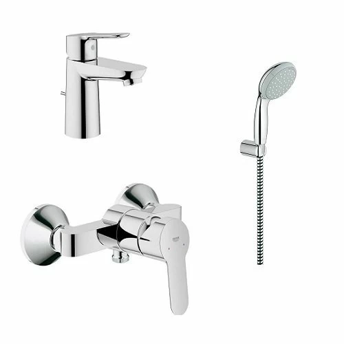 Setul de baterii 3in1 gama Grohe colectia Bau Edge cu montaj pe perete. Este fabricata din alama sanitara cu finisaj crom si compus din: bateria monocomanda pentru lavoar cu cartus ceramic Grohe SilkMove 28 mm (cod 23328000), sistem de economisire a apei Grohe EcoJoy aerator 5,7 l/min si suprafata cromata Grohe StarLight; baterie de dus monocomanda cu cartus ceramic Grohe SilkMove 46 mm (cod: 23333000) si setul de dus cu porter Tempesta (cod: 27849001).