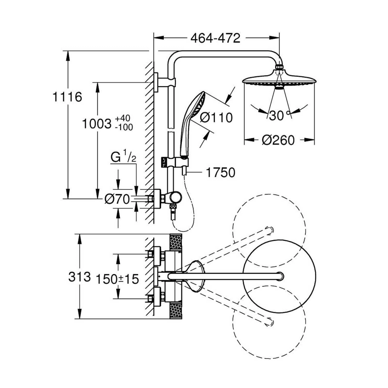Inclus in set, bratul de dus orizontal ajustabil pe o lungime de 450 mm si termostatul expus cu functie Aquadimmer permit comutarea intre capul de dus Euphoria 260 (26 455), care ofera 3 tipuri de jet: Ploaie, SmartRain, Jet, cu un unghi de rotatie de ± 15°. Dusul manual Euphoria 110 Massage (27 221) ofera, de asemenea, 3 tipuri de jet: Ploaie, Masaj, SmartRain, si este reglabil in inaltime cu elementul de alunecare.