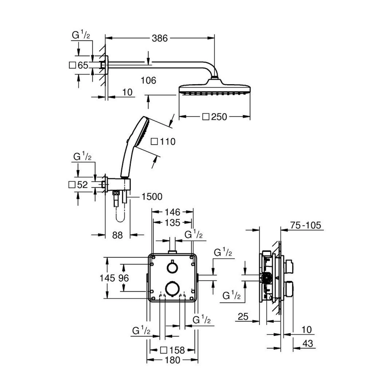 Sistemul vine cu cutia de racordare universala GROHE Rapido SmartBox, 1/2” (corp ingropat), asigurand o instalare simpla si sigura. Setul de dus include un cap de dus Vitalio Comfort 250, de dimensiuni generoase, montat pe un brat orizontal, pentru un confort sporit.
