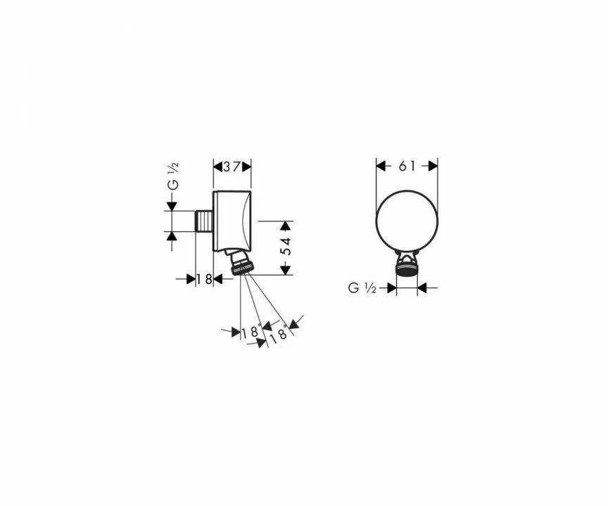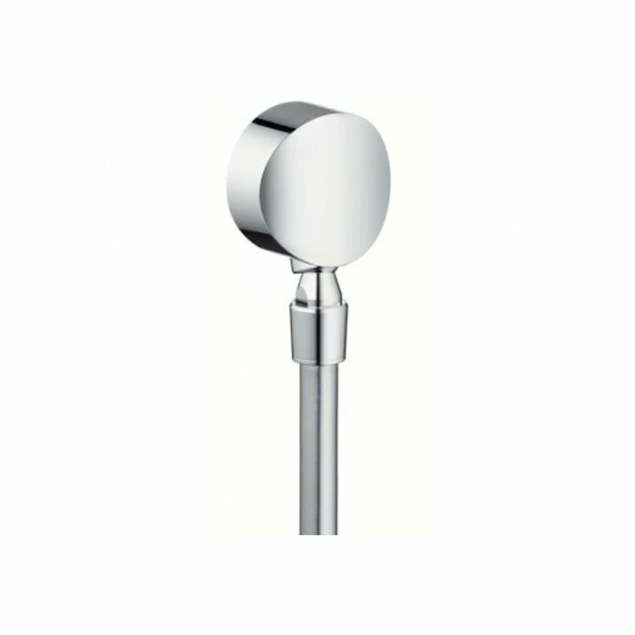Cot de iesire pentru dus cu montaj pe perete, forma rotunda si finisaj crom, valva anti-reflux integrata si imbinare pivotanta pentru orientarea furtunului de dus.