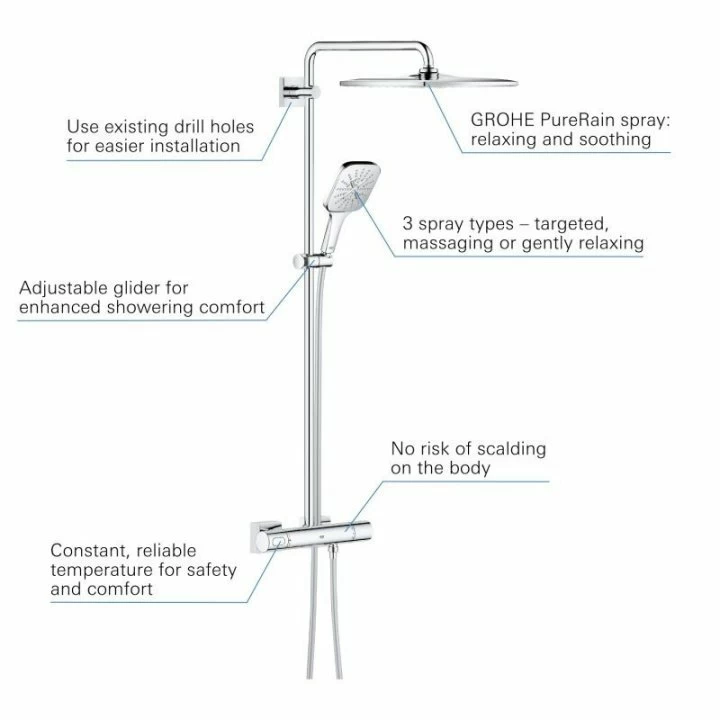 Setul de dus face parte din gama Grohe colectia SmartActive si cuprinde: brat de dus 45cm orizontal rotativ, termostat aparent cu functie Aquadimmer, head shower Rainshower Mono 310 Cube cu racord cu bila si unghi de rotatie de ± 15°, para de dus Rainshower SmartActive 130 Cube ajustabila in inaltime cu element culisant, furtun de dus Silverflex 175cm ,cartus TurboStat compact cu termoelement din ceara. Bateria are oprire de siguranta SafeStop la 38°C, limitare optionala de temperatura la 43°C cu SafeStop Plus, fara risc de oparire cu CoolTouch. Pulverizare perfecta cu tehnologia Grohe DreamSpray, suprafata cromata Grohe LongLife Shine,limitator de debit Grohe Water Saving la 9.5l/min, sistem anticalcar SpeedClean. Produsul este compatibil cu boilere de la 18 kW/h, avand un debit de minim 7l/min. Presiunea minima recomandata este de 1.0 bar