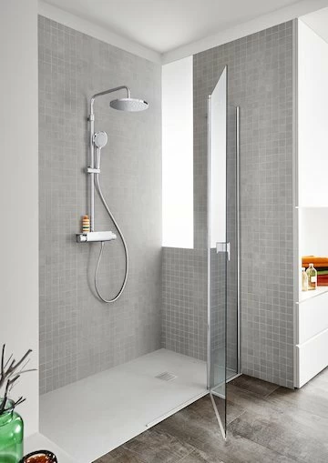 Sistem pentru dus cu montaj pe perete, cu finisaj crom. Include para de dus manual Sensum Round cu diametru de 130 mm cu 4 functii (cod: 5B1107C00), coloana dus termostatica cu polita (cod: 5A2A88C00) dotata cu tehnologia Quick Reaction care regleaza debitul si temperatura in mai putin de 3 sec., mentinandu-le constante astfel economisind apa si energie; cap de dus cu instalare pe tavan sau pe perete Rainsense (cod: 5B2250C00) dotat cu sistemul Easyclean si functia Rain, furtun flexibil de PVC satinat de 2m si suport cu inaltime reglabila de la 800 la 1200 mm. Detine doua cai derivatoare, si implicit doua evacuari de apa.