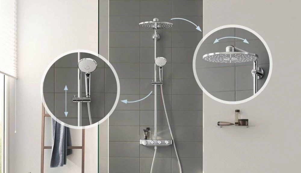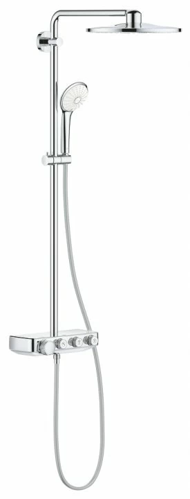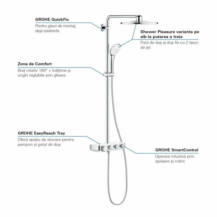 Sistemul pentru dus Grohe face parte din colectia SmartControl, fabricata din alama sanitara de culoare crom cu montaj pe perete. Sistem de dus cu baterie termostatata este compus din: brat de dus orizontal de 450 mm; suport superior cu ajustare variabila pentru adaptare minima la orificiile de fixare existente; baterie cu termostat; dus fix Rainshower 310 SmartActive; placa de pulverizare cromata, para de dus Euphoria 110 Massage; suprafata de pulverizare alba, 3 tipuri de jet: Rain, SmartRain, Massage; furtun de dus Silverflex 1.750 mm. Caracteristicile deosebite ale acestui sistem de dus sunt tehnologiile Grohe: DreamSpray fiind o tehnologie ce asigura distributie egala si uniforma a apei, indiferent de tipul de pulverizare selectat; StarLight prin care suprafata cu finisaj cromat ofera luciu superior pe termen indelungat, rezistenta la zgarieturi si permite curatarea usoara a acesteia; CoolTouch avand bateria cu izolatie integrata pentru preventia supraincalzirii suprafetei, caracteristica importanta, in special, pentru siguranta copiilor; TurboStat care asigura control precis a apei si temperatura constanta, indiferent de fluctuatiile presiunii. EcoJoy o tehnologie de economisire a apei cu pana la 40%, fara a compromite calitatea jetului de apa; SafeStop Plus o functie de siguranta pentru temperatura apei, setata la 38°C. Selectia unor temperaturi mai mari se face prin apasarea butonului.Optional, pentru siguranta suplimentara se activeaza limitatorul de temperatura GROHE SafeStop Plus, care nu depaseste 43°C; EasyReach prin care bateria este prevazuta cu etajera pentru depozitarea produselor de ingrijire si detasabila pentru curatare rapida si usoara; SpeedClean tehnologie dedicata duzelor din silicon cu suprafata anticalcar, permite indepartarea cu usurinta a depunerilor de calcar printr-o simpla stergere cu mana sau carpa uscata; InnerWater Guide aceasta fiind o izolatie puternica ce previne supraincalzirea suprafetei parei de dus, sustine protectia si rezistenta finisajului acesteia pe termen indelungat; si tehnologia TwistFree prin care se pastreaza furtunul de dus flexibil si ii mentine forma, prevenind rasucirea acestuia.