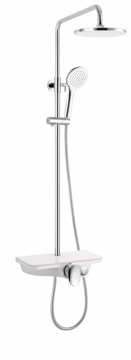 Sistemull de dus Sanotechnik cu dimensiunea de 860-1210x280x550 mm are doua culori placute alb si crom. Etajera din sticla securizata alba impreuna cu reglajul pe inaltime, bateria cu comutator de functii cu buton alba, dispensorul de dus fix crom, dispensor de dus mobil cu o singura functie de culoare crom, suportul de dus mobil crom si furtunul de dus 1,5 m fac pachetul complet pentru a avea un design interior perfect.