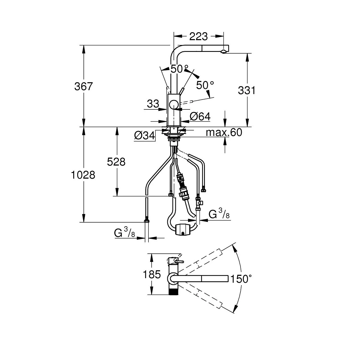 Un buton separat permite accesul la apa filtrata, in timp ce canalele interne distincte pentru apa filtrata si nefiltrata pastreaza gustul pur al apei potabile. Controlul temperaturii si debitului se realizeaza precis si fara efort datorita cartusului ceramic Grohe SilkMove de 28 mm, recunoscut pentru durabilitate si actionare lina.