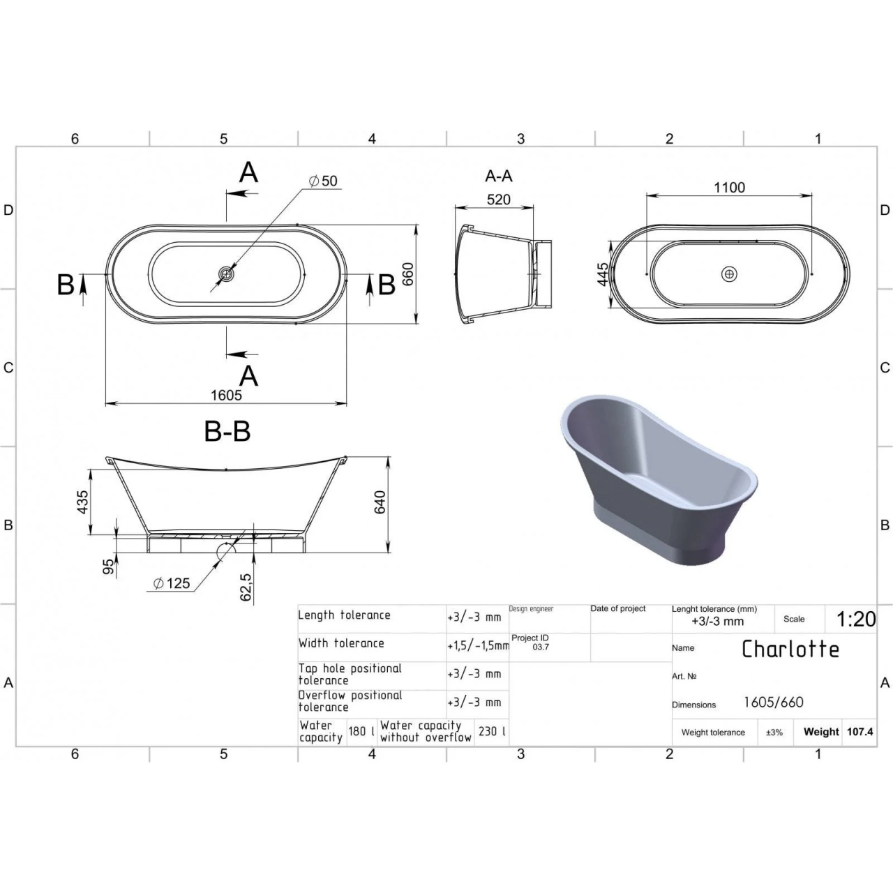 Cada freestanding din compozit, model Charlotte, cu dimensiuni de 1605 mm lungime, 660 mm latime si 640 mm inaltime. Are o forma ovala, finisaj alb mat obtinut prin slefuire si o capacitate de 230 litri. Greutatea totala este de 107 kg. Nu este prevazuta cu orificiu de preaplin.