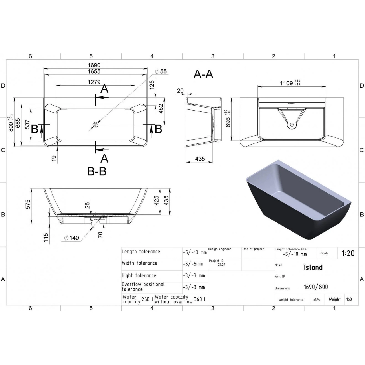 Forma este dreptunghiulara, dimensiunile sunt 1690 mm lungime, 800 mm latime si 575 mm inaltime. Greutatea totala este de 160 kg. Volumul total este de 360 litri, iar volumul util (cu supraplin) este de 280 litri.