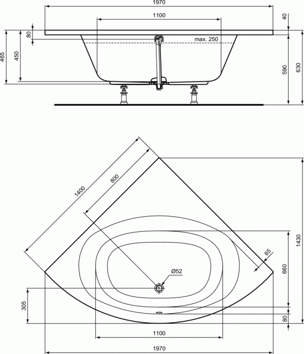 Cada de colt din gama Ideal Standard colectia Hotline, este confectionata din material acrilic sanitar de 4 mm de culoare alba. Având dimensiunile 1400x1400 mm, este o cada voluminoasă cu capacitatea de 250 litri. Se monteaza cu masca, picioare si coloana de scurgere (vezi produsle recomandate).
