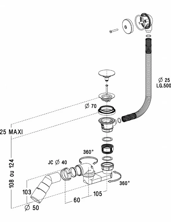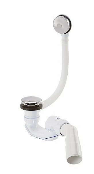 Set automat de scurgere şi preaplin de tip „ click-clack” cu sifon cu autocuratare,dop şi supapa de golire, din alama acoperita cu crom; capac cu diametrul 70 mm; teava cu lungimea de 500 mm; arc de scurgere 135°, scurgere 40/50 mm: pentru cazi standard şi cadițe de dus cu orificiu de scurgere cu diametrul Ø 50.