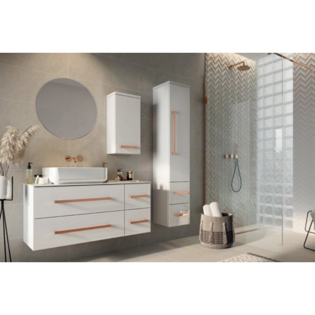 Alegerea culorii nuc rockford pentru mobilier, manerele cromate si rafturile albe adauga un strop de eleganta si rafinament, intr-un stil minimalist ce se va potrivi cu orice decor de baie.