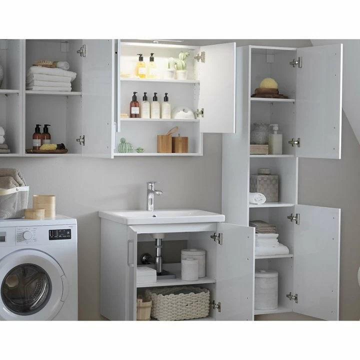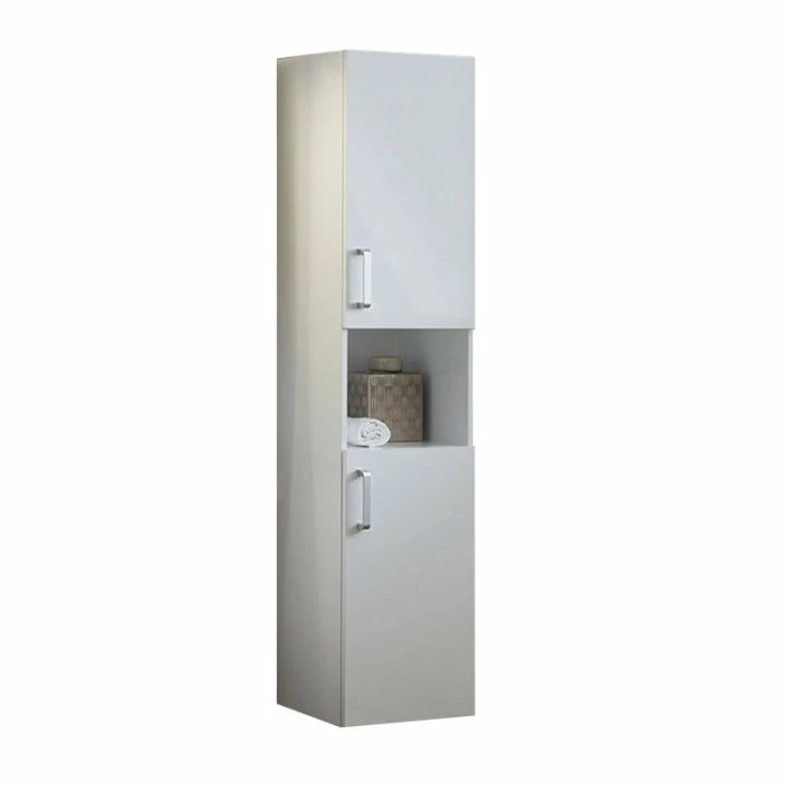 Dulapul inalt din gama Kolpasan, colectia Evelin, se monteaza suspendat, prezinta 2 usi cu maner cromat si 1 polita deschisa, este realizat din material front: MDF , materialul corpului este PAL special acoperit cu folie, are culoarea alb, si are urmatoarele dimensiuni : 370 x 346 x H1700 mm. Avantajele MDF-ului sunt urmatoarele : rezistenta mult mai mare la umezeala, permite frezare pe suprafata placii astfel obtinand forme deosebite ale fronturilor; la mobilierul de baie, unde este foarte mare umezeala, este indicat sa folosim suprafete vopsite care sunt cele mai rezistente. Cum palul nu poate fi vopsit, folosirea MDF-ului este cea mai indicata. Colectia Pandora se caracterizeaza prin armonia liniilor uniforme, moi, imbinate intr-un stil contemporan.