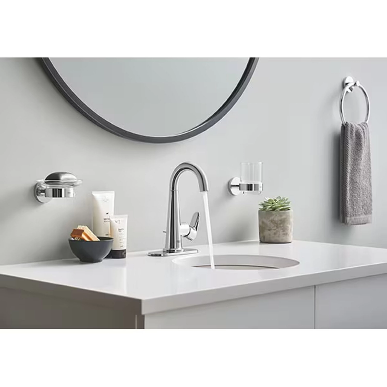 Pachetul include suportul (40369001) si savoniera (40368001), iar fixarea pe perete este ascunsa pentru un aspect curat si elegant. Suprafata GROHE Long-Life asigura o rezistenta de durata, pastrandu-si aspectul impecabil in timp.