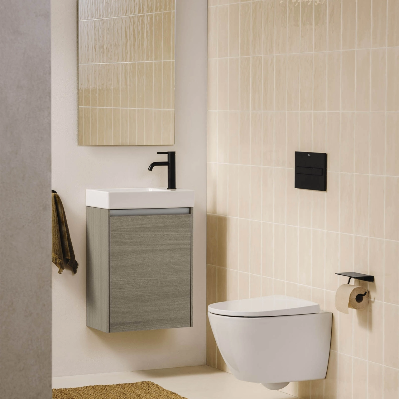 Dulapul in tonuri de stejar deschis, cu finisaj natur, adauga caldura si autenticitate spatiului. Lavoarul alb, cu un finisaj lucios si construit din Fineceramic® (o ceramica 100%, cu 40% mai usoara si 30% mai rezistenta), aduce un contrast elegant. Materialul MDF pentru dulap asigura durabilitate si rezistenta.