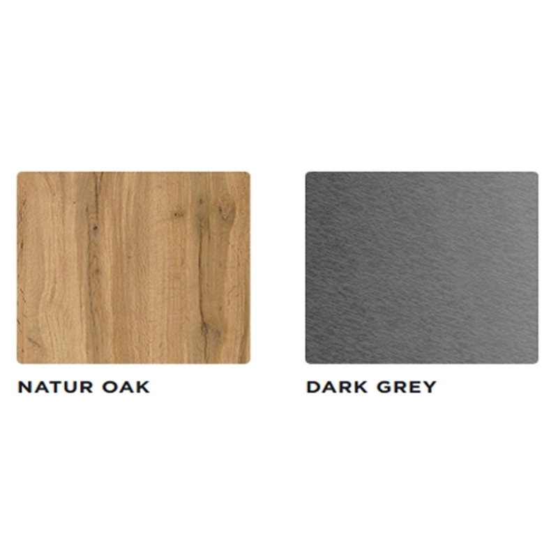 Mobilierul este prevazut cu doua sertare spatioase, echipate cu sistem de inchidere lenta soft close, care asigura o utilizare confortabila, silentioasa si sigura. Fronturile sunt realizate din MDF acoperit cu folie 3D, un material recunoscut pentru rezistenta superioara la umezeala si pentru posibilitatea de a obtine finisaje decorative deosebite. Manerele metalice completeaza designul si asigura o utilizare practica in timp. Finisajul stejar natur adauga un plus de caldura si rafinament, integrandu-se usor in diferite stiluri de amenajare.