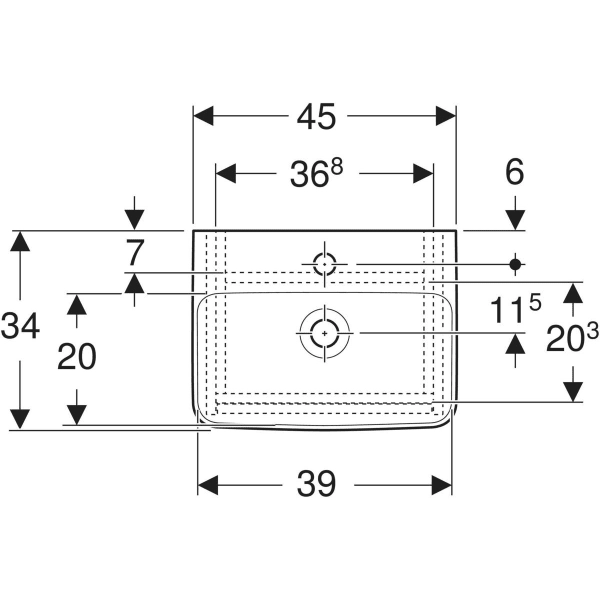 Lavoarul are o latime de 45 cm si este prevazut cu un orificiu de robinet pozitionat centrat si un sistem de preaplin vizibil, dispus simetric. Din punct de vedere al organizarii interne, unitatea include un raft cu pozitie modificabila, oferind flexibilitate in depozitare. Produsul este realizat din lemn provenit din silvicultura sustenabila cu origine certificata si este livrat complet asamblat. Ansamblul este compatibil cu accesorii optionale precum suportul magnetic Geberit sau setul de picioare ingust (se vand separat).