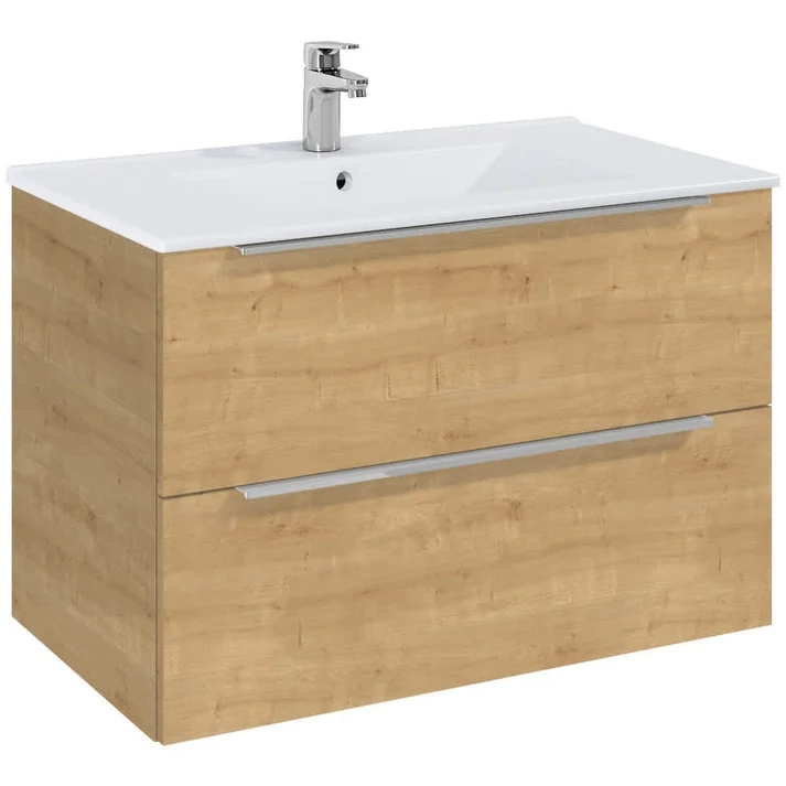 Setul include o baza pentru lavoar suspendata, realizata din PAL cu finisaj bej, prevazuta cu doua sertare incapatoare. Acestea sunt dotate cu sistem de extractie completa, deschidere tip push si inchidere lenta, oferind un plus de confort si usurinta in utilizare. Lavoarul din ceramica, cu finisaj alb, se monteaza pe blat si este prevazut cu orificiu pentru baterie si preaplin, completand armonios intregul ansamblu.