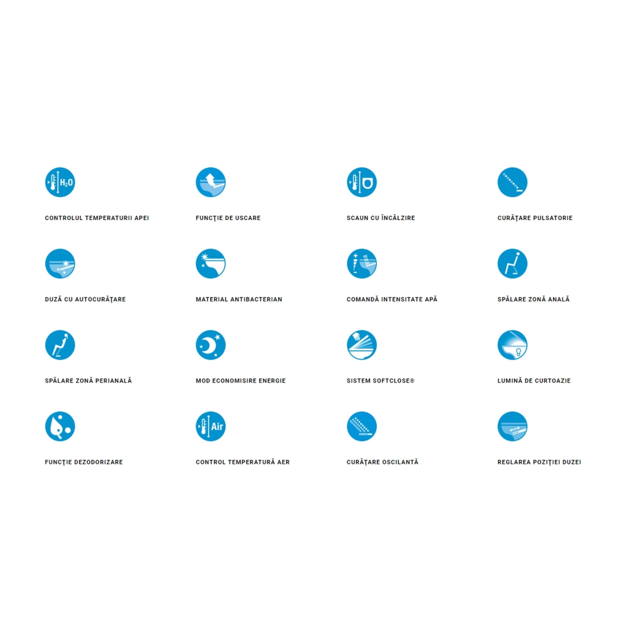 Capacul Multiclean integreaza functii precum controlul temperaturii apei, functie de uscare, scaun cu incalzire, curatare pulsatorie, duza cu autocuratare, material antibacterian, control intensitate apa, spalare zona anala si perianala, mod economisire energie, lumina de curtoazie, functie de dezodorizare, control temperatura aer, curatare oscilanta si reglarea pozitiei duzei. Cu Roca Multiclean Premium Round, obtii o solutie rapida si usoara pentru o igiena intima maxima in baia ta.