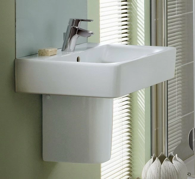 Setul promotional include lavoarul cu proiectie scurta, care face parte din gama Ideal Standard, colectia Connect Space, se monteaza cu semipicior (cod E797401). Fiind un lavoar ingust de 380 mm, este ideal pentru baile de dimensiuni mici. Este prevazut cu un orificiu central pentru baterie si unul pentru preaplin. Semipiedestalul Connect este realizata din portelan sanitar de culoare alba.