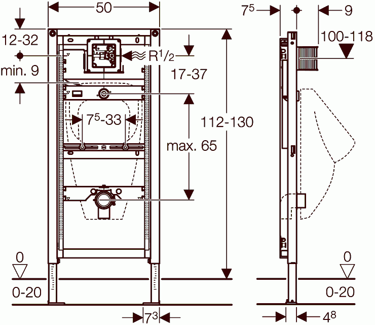 Cadrul este prevazut cu: element inaltime 112 cm, reglabil pana la 130 cm,gauri Ø9 mm pentru fixare in constructii cu panouri din lemn, picioare galvanizate, reglabile 0-20 cm, acoperit cu pulbere de culoare albastru Geberit, placa picioare rotativa,conectori apa 1/2", conexiunea la apa poate fi facuta fara instrumente, valva stop pre-montata, conducta pre-montata pentru pompa de clatire, capacul de protectie pentru golul de service, conexiune spalare la racord, fixare pentru conducta de spalare Ø32 mm, inaltime reglabila, fixare pentru suprafetele ceramice, distanta si inaltime ajutabile, fixare pentru cot evacuare, picioare auto-blocante. Cadrul contine: cutie protectie cu capac, carcasa incastrata cu sectiune apa, conectori apa R 1/2", teava de conexiune intre racord Ø32 mm si pisoar, incluzand sigiliul pe pisoar, cot evacuare Ø63/57 mm pana la Ø50/44 mm, 2 tije, filetate M8 pentru fixare pisoar si material fixare.