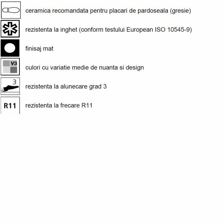 Caracteristici: Rezistenta inghet/dezghet, Rezistenta la abraziune, Rezistenta la pete, Rezistenta la solutii chimice