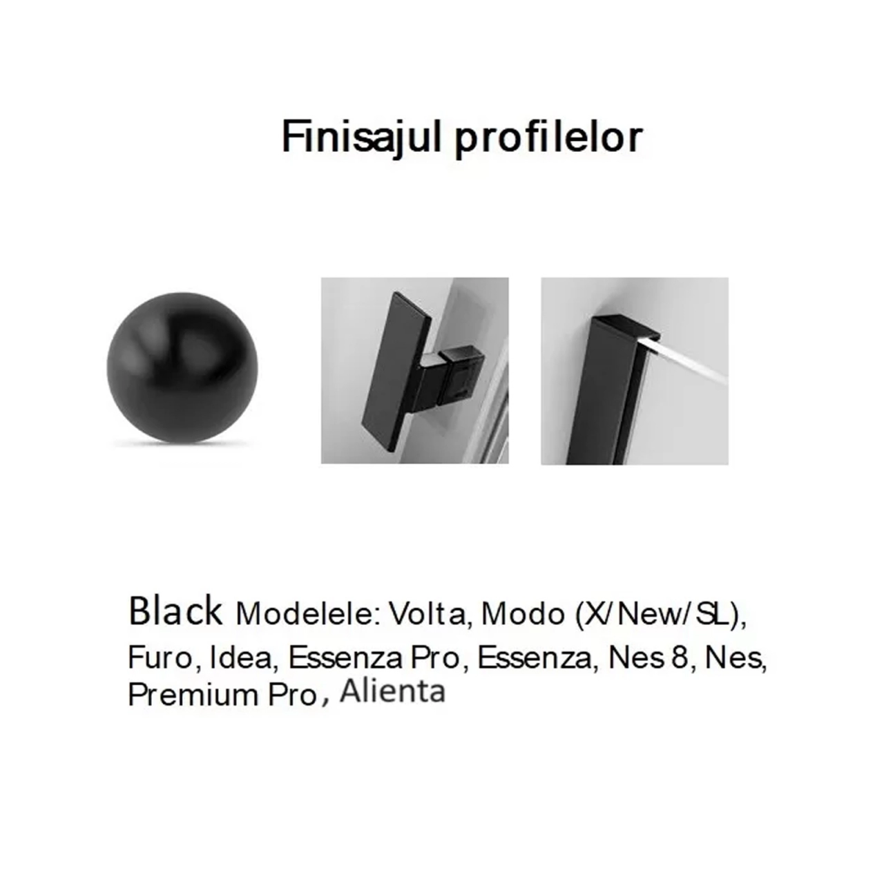 Cabina poate fi instalata direct pe pardoseala sau pe caditele de dus compatibile achizitionate separat. Finisajul profilelor si accesoriilor este negru mat.