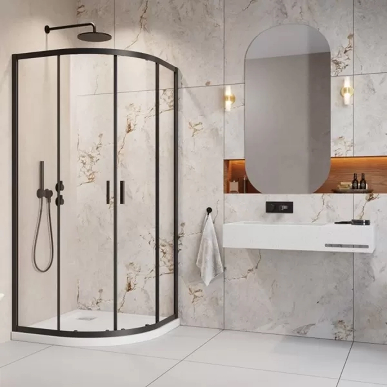 Cabina de dus Alienta Black A este echipata cu un sistem de usi culisante format dintr-o parte fixa si una mobila, montate pe role duble in partea superioara si inferioara pentru o glisare lina si silentioasa. Sistemul de fixare pe perete prin profile permite compensarea denivelarilor acestuia.