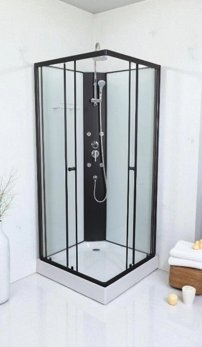 Cabina este realizata din sticla securizata de 4 mm, rezistenta si sigura in utilizare, disponibila in varianta transparenta. Profilele din aluminiu cu finisaj negru mat adauga un aspect contemporan si elegant, potrivindu-se perfect in baile amenajate in stil modern sau industrial. Usile glisante sunt prevazute cu role duble pentru o culisare lina si etansari magnetice care asigura inchiderea ferma si prevenirea scurgerilor de apa.