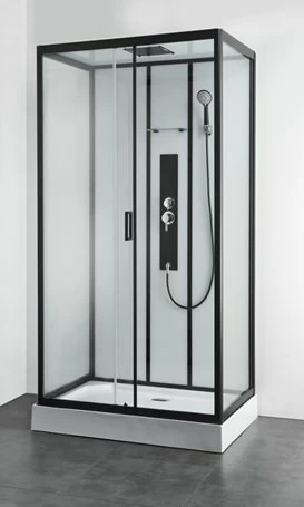 Cabina de dus semirotunda cu deschidere culisanta pe colt Sanotechnik face parte din colectia Quickline, avand sticla spate securizata de culoare alba de 4 mm iar sticla securizata transparenta de 5 mm pe fata cu un invelis anti-calcar ce impiedica depunerea calcarului si ajuta la o curatare mai usoara atat pe partile fixe, cat si pe cele mobile, dispersor fix tip multijet din otel inoxidabil finisat cu profilele din aluminiu de culoare negru mat iar montajul cabinei se poate realiza pe cadita de dus. Posibilitatea de culisare a usilor pe role duble metalice silentioase si dimensiunea de 800 x 1200 x H2250 mm, denota un avantaj real in curatarea si igienizarea acesteia. Sistemul de inchidere al cabinei se realizeaza prin chedere magnetice. Ii este atribuita: un dispersor mobil cu 3 functii; un suport fix pe partea laterala din sticla; etajera din sticla; chedere antistropi; cadita de dus din acryl cu masca fixa, cadru metalic si picioare reglabile si sifon de scurgere.