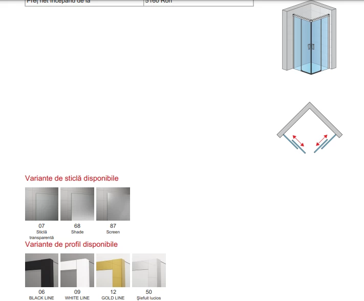 Gama variata de profile (argintiu mat, alb, negru mat, negru lucios, crom) si variantele de sticla si paravene folosite (sticla transparenta, cu model, sablata, cu efect de oglinda sau cu diverse decoruri) creaza designuri inedite si personalizabile. Sticla folosita la cabinele de dus si la paravanele pentru cazi este securizata si tratata cu un strat de protectie Aquaperle care permite o curatare usoara.