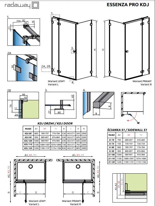 Cabina de dus Essenza Pro Gold KDJ are urmatoarele dimensiuni : 1100x900xH2000 mm, prima dimensiune este a usii, este formata din 2 elemente, usa cabinei si peretele fix, usa este pivotanta si latimea de acces este de 605 mm, iar domeniul de reglaj este de 989-997 mm. Sticla securizata are grosimea de 6 mm si este acoperita cu strat de protectie Easy Clean.