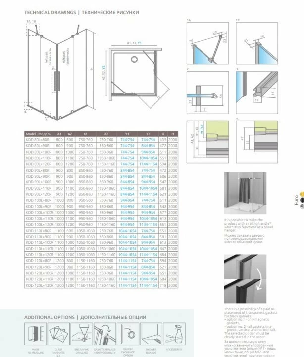 Seria Furo este caracterizata de o calitate fara precedent printre cabinele de dus cu sistem de glisare. Prin renuntarea la ghidajul din partea superioara si asezarea usii pe role in partea de jos, am obtinut o cabina de o eleganta, luminozitate si transparenta extraordinara. Rolele sunt montate la nivelul sticlei la interior, facand astfel mai usoara curatarea cabinei . Cabina de dus formata din 2 usi glisante + 2 parti laterale fixe. Cabina prezinta mecanism de ajustare a profilelor care permite compensarea iregularitatilor peretilor. Usa gliseaza prin fata partii fixe, oferindu-ne astfel o intrare spatioasa si confortabila. Laturile cabinei sunt de 1100 mm stanga si 1100 mm dreapta, iar inaltimea cabinei este de 2000 mm. Cabina de dus este fabricata din sticla securizata cu grosimea de 8 mm, acoperita cu stratul EasyClean, care ajuta la pastrarea curateniei cabinei si faciliteaza procesul de intretinere al acesteia (proprietati hidrofuge, datorita carora picaturile de apa nu se mentin pe suprafata sticlei, ci se scurg, fara a lasa depuneri). Sistemul de fixare de perete cu profile - permite preluarea curburii peretelui . Cabina prezinta sistem inovator de ghidare si incetinire a miscarii usii. Cabina poate fi montata cu usurinta atat pe cadita de dus, cat si direct pe pardoseala.