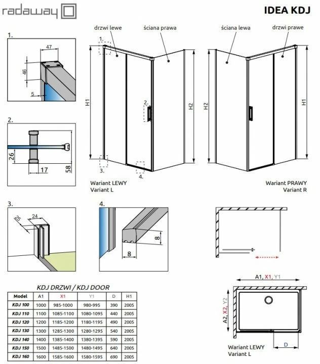 Idea Gold este o serie de cabine de dus expresiva , caracterizata de forme geometrice care creaza un intreg proportional . Detaliile aurii sunt parte a unor produse impresionante si sofisticate , care sunt pe placul celor care cauta solutiile neuzuale si avantgardiste. Cabina de dus dreptunghiulara din seria Radaway Idea Gold KDJ are urmatoarele dimensiuni : 1100x700XH2005 mm, prima dimensiunii este a usii, usa este pe partea dreapta, latimea de acces este de 440 mm, este realizata din sticla securizata de 6 mm, are profil si manere de culoare auriu. Sistemul de fixare de perete cu profile - permite preluarea curburii peretelui. Exista posibilitatea de a debloca usa si a o bascula pentru a curata cabina mai bine. Glisorul minimalist garanteaza functionarea silentioasa a usii si prezinta mecanism invizibil de schimbare si reglare a usii. Banda magnetica asigura etansarea cabinei. Garniturile din elastomer rezista la schimbari de temperatura si umiditate. Aceasta cabina de dus poate fi montata atat pe cadita de dus, dar si direct pe pardoseala-cu cantul sticlei sau muchia profilului de-a lungul bordurii placilor ceramice. In varianta standard, toate componentele necesare pentru asamblarea cabinei de dus sunt adaugate produsului, indiferent daca este cabina cu, sau fara prag. Toate instructiunile necesare pot fi gasite in manualul de instalare. Sticla este acoperita cu tehnologie EasyClean, un strat care faciliteaza procesul de curatare. Ansamblul cabinei de dus se compune din doua parti: usa culisanta si perete lateral. Usa cabinei de dus Ideea Gold KDJ este formata dintr-o parte fixa si o parte mobila, de calitate superioara cu amortizor inovator si sistem de ghidare unic, care asigura o buna functionare si rulare linistit.