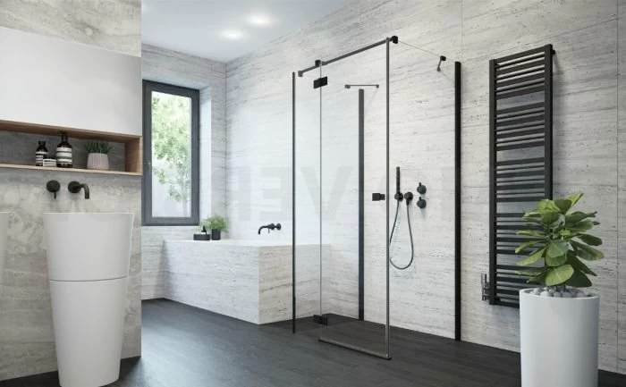 Usa cabina de dus face parte din gama Radaway, colectia Essenza New Black KDJ+S avand un mecanism silentios de glisare a usilor batante si dimensiunea de 800 x H2000 mm. Este cu deschidere pe stanga si confectionata din sticla securizata cu o grosime de 6 mm. Cu ajutorul stratului de protectie cu proprietati hidrofuge EasyClean mentine curata suprafata si permite intretinerea usoara a acesteia. Finisajul profilului este negru mat iar montajul cabinei se poate realiza pe cadita de dus sau direct pe pardoseala. Stabilitate foarte buna asigurata de mecanismul de ajustare a profilelor care permite compensarea iregularitatilor peretilor. Formarea cabinei se realizeaza prin etansare la doi pereti (vezi produsele recomandate) printr-o banda magnetica si o garnitura de elastomer rezistenta la temperatura si umiditate.
