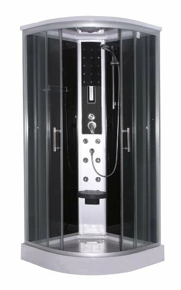 Cabina de dus Sanotechnik, colectia QuickLine are o dimensiune de 90 x 90 x 215 cm si este alcatuita din sticla securizata de 5 mm, 6 duze de hidromasaj si usi glisante cu role duble. Spatele cabinei este confectionat din sticla neagra, detine profile din aluminiu, un dispersor fix, dispersor mobil, etajera din sticla. Cabina de dus cu hidromasaj are in dotare un scaun rabatabil, Radio + difuzor, ventilator.