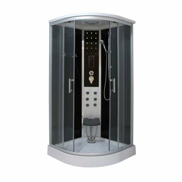 Cabina de dus cu hidromasaj si sauna umeda Sanotechnik Relax, este fabricata din sticla securizata cu grosimea de 5 mm vopsita negru in spate si transparenta in fata. Profilele sunt din aluminiu cu finisaj mat, manerele din otel inoxidabil iar usile culiseaza pe role duble. Dotata cu baterie cu trei functii, suport tip bara reglabil pentru dispersorul mobil care are trei tipuri de jet, dispersor fix, sase duze de hiromasaj, panou de comanda electronic cu touchscreen si radio cu difuzor. Generatorul de aburi pentru sauna are puterea de 3KW, iar ventilatorul si iluminarea cu led vor crea pentru dumneavoastra o atmosfera placuta. Etajera de sticla este un suport stabil pentru produsele cosmetice specifice, in timp ce scaunelul care sustine o greutate de pana la 100 kg, este rabatabil avand posibilitatea de pliere in sus pe perete atunci cand nu doriti sa il folositi. Dotata cu set de chedere antistropi care impiedica patrunderea apei in exterior si chedere magnetice pentru inchiderea etansa a usilor, cabina este dotata cu capac superior din ABS. Cadita de dus dotata cu sifon de scurgere, are inaltimea exterioara de 125 mm iar adancimea interioara 20mm, este fabricata din ABS si fixata pe cadru metalic cu picioare reglabile ascunse sub o masca fixa.