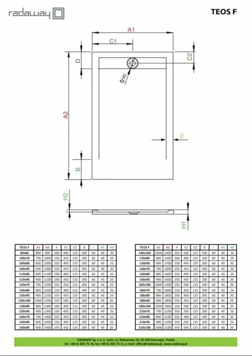 Cadita de dus dreptunghiulara din gama Radaway, colectia Teos F detine proprietati anti-alunecare care asigura o utilizare sigura. Cadita de dus este confectionata din marmura compozita de culoare alba. Aceasta se monteaza direct pe pardoseala avand incorporat o rigola, iar orificiul pentru sifon este de 90 mm. Se recomanda achizitionarea unui sifon cod.HS1 (vezi produsele recomandate). Spre deosebire de alte cazi, acestea se pot decupa la dimensiunile non-standard dorite de catre client. Dimensiunile caditei sunt de 900 mm lungime, 800 mm latime si 40 mm inaltime.