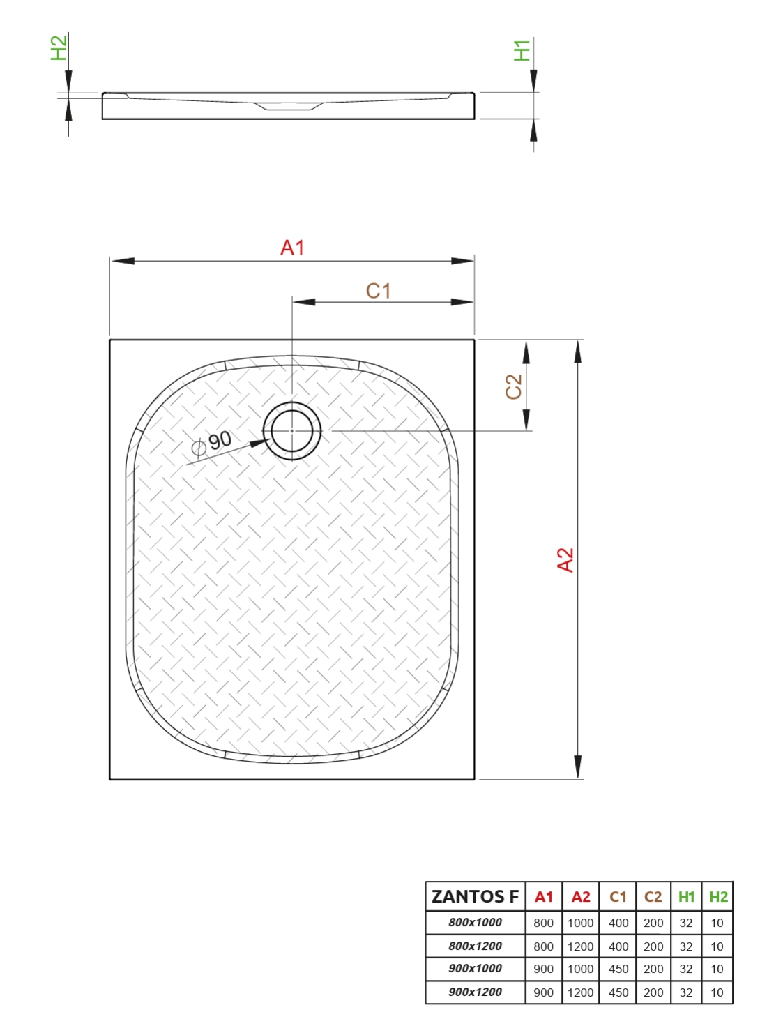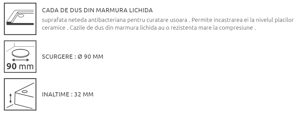 Cadita de dus dreptunghiulara Zantos F, se monteaza direct pe pardoseala, are suprafata extrem de lucioasa si neteda, antibacteriana pentru o curatare usoara, rezistenta la mucegai si umezeala, orificiul pentru sifon este de 90 mm, iar adancimea caditei este de 10 mm.